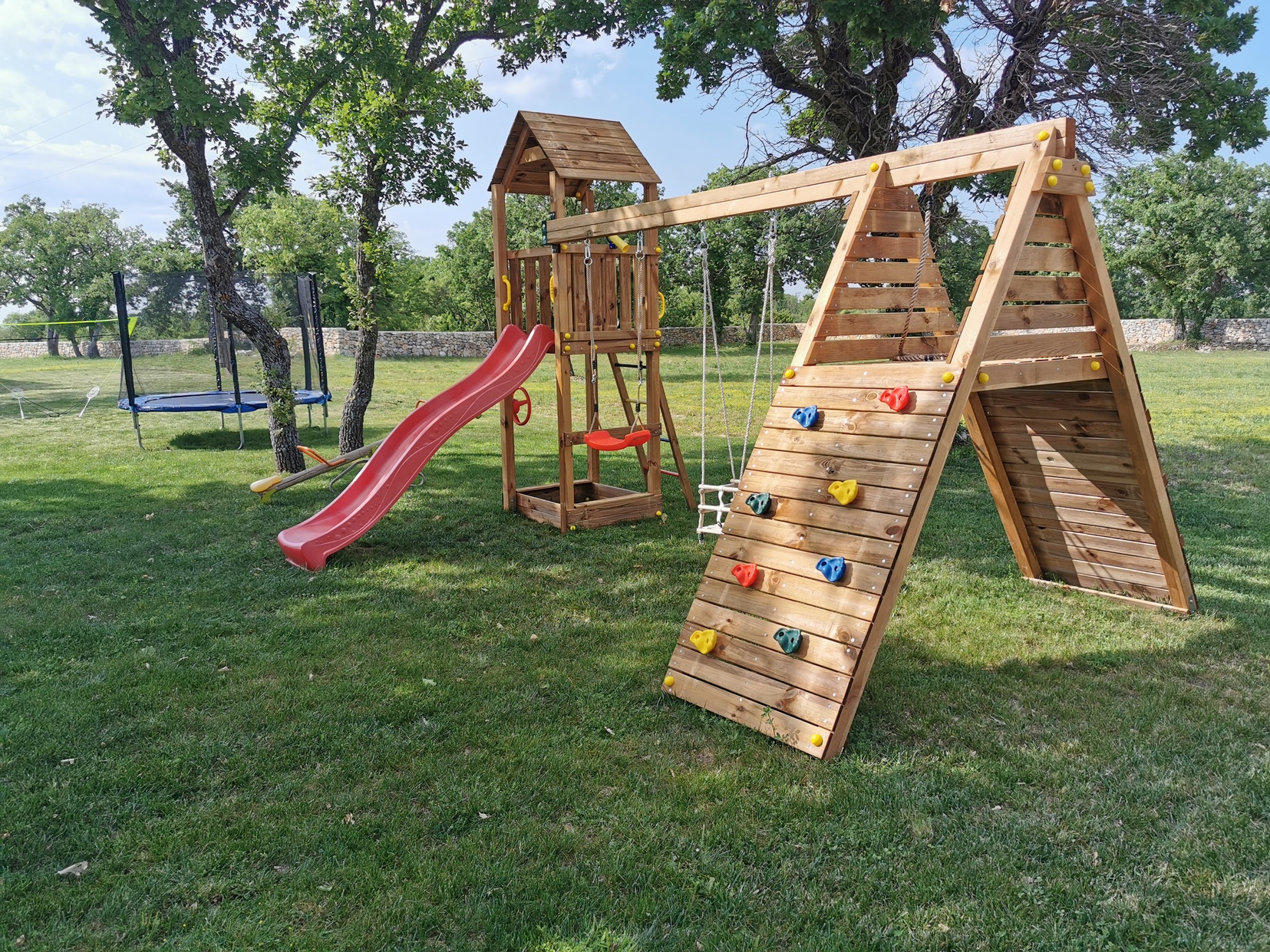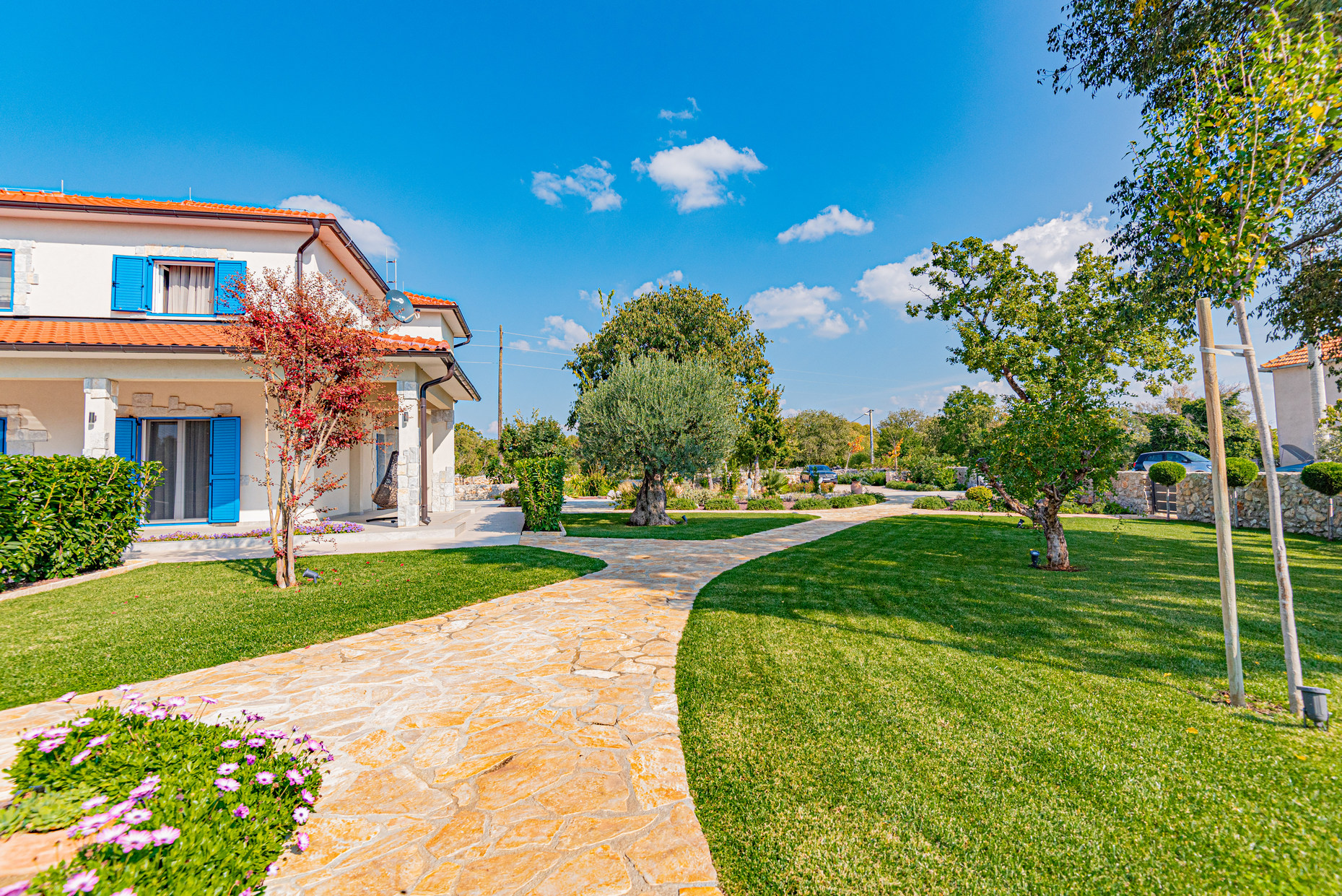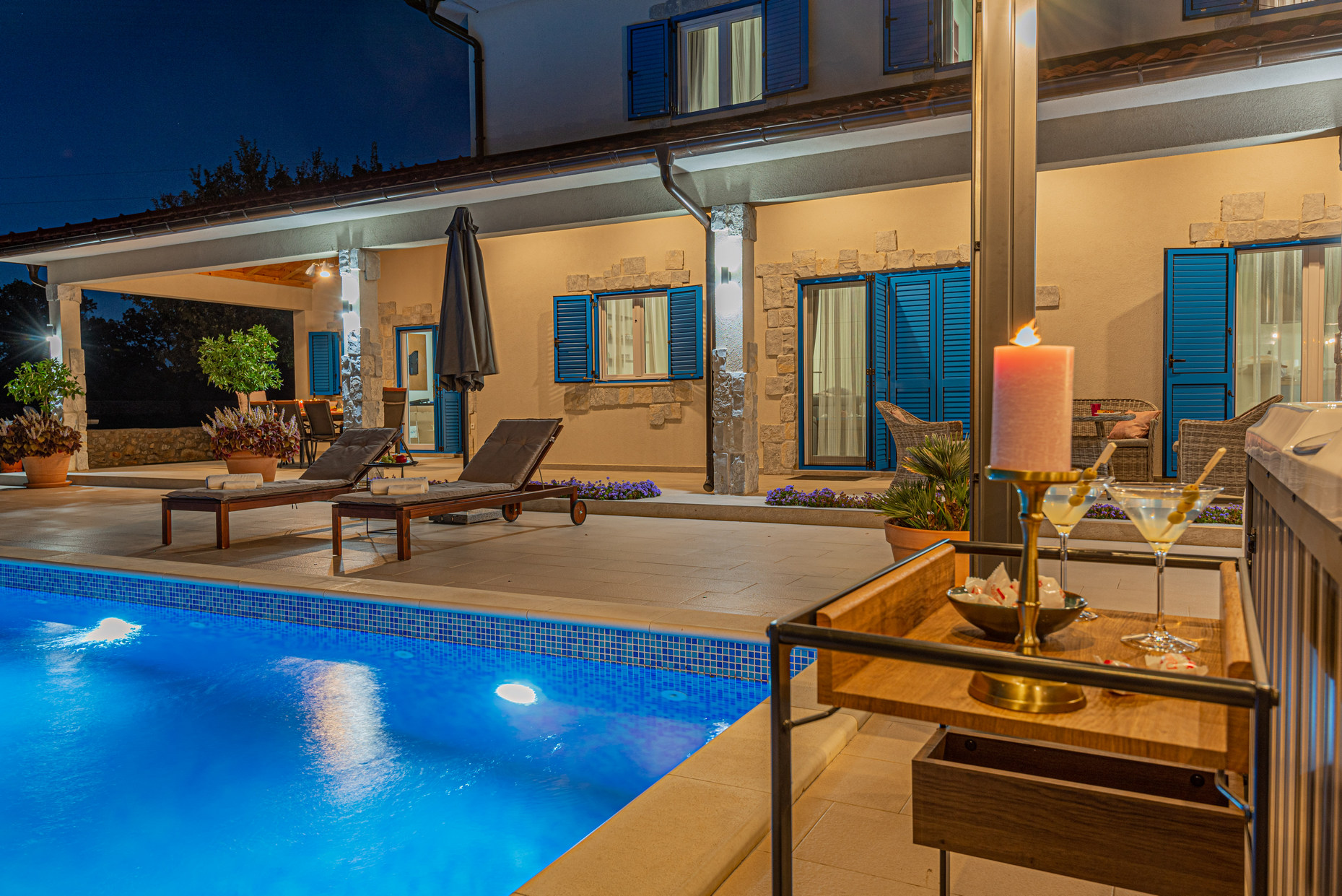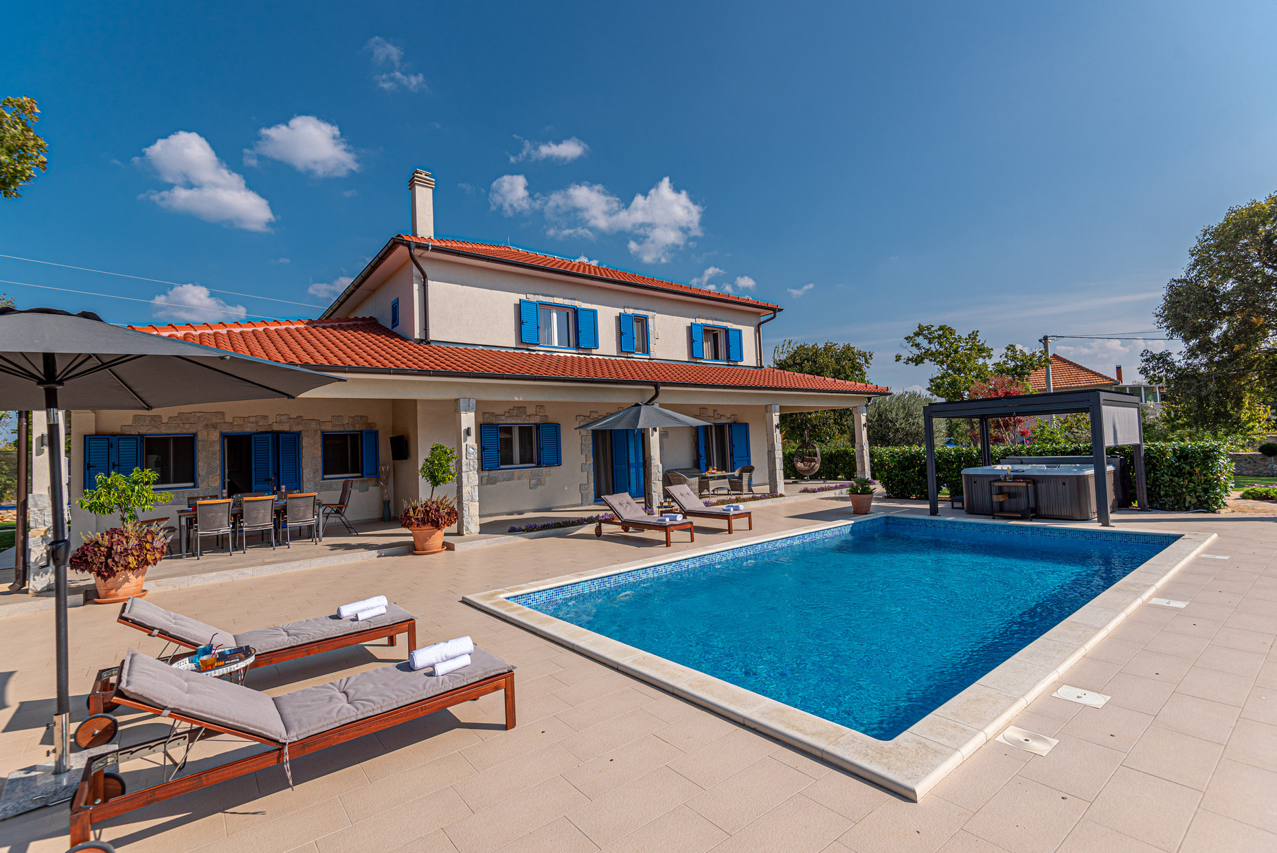 Der fantastische Außenbereich der Villa Romansa ist sowohl vom Wohnzimmer als auch von der Küche aus zu erreichen. Nicht nur mit seinem atemberaubenden Raum, sondern auch mit seinen Möglichkeiten verleiht dieser Außenbereich Ihrem Urlaub etwas Besonderes. Sie werden beeindruckt sein von dem mediterranen Garten, der sorgfältig gepflegten Grünfläche und dem Blumengarten, die mit ihren Farben und ihrer Dekoration verzaubern. Hier finden Sie Erholung für Körper und Seele, aber auch für den Gaumen, denn den Gästen steht ein Obstgarten zur Verfügung, dessen Früchte während der Saison frei serviert werden können. Die kleinen Gäste haben einen eigenen Spielplatz, der ihnen viel Spaß garantiert, und die erwachsenen Gäste werden zufrieden sein. Rund um den türkisblauen Pool in der Mitte der Terrasse befinden sich 9 Sonnenliegen und ein überdachter Whirlpool. Das garantiert Ihnen einen entspannten und angenehmen Urlaub. Darüber hinaus verfügt die Villa Romansa über moderne Gartenmöbel und einen Holz-/Holzkohlegrill. Mit ihren leuchtend blauen Fensterläden ist die Villa Romansa ein idealer Ort, um sich von der Hektik der Stadt und dem beschleunigten Lebensrhythmus zu erholen.